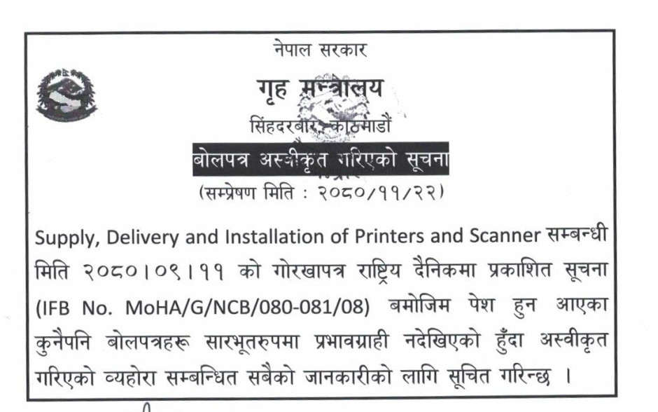 बोलपत्र अस्वीकृत गरिएको सूचना