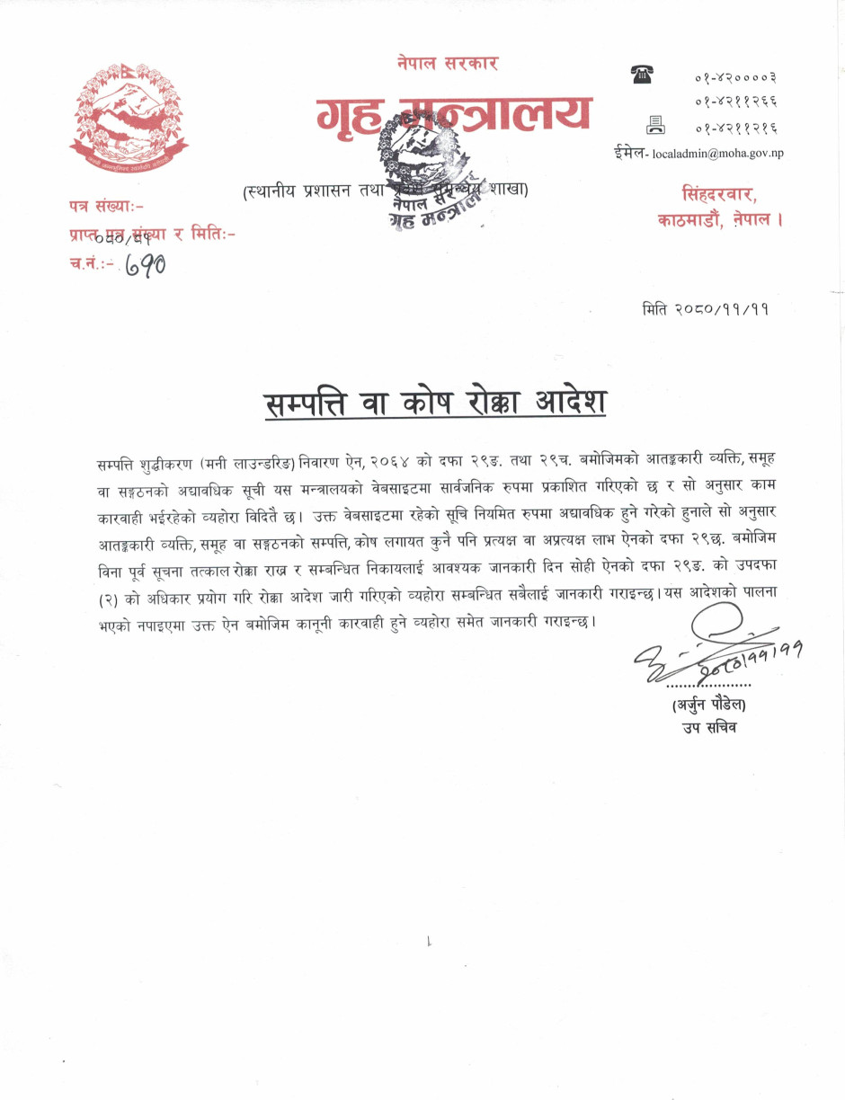सम्पत्ति वा कोष रोक्का आदेश (मार्च २०२६ सम्म)
