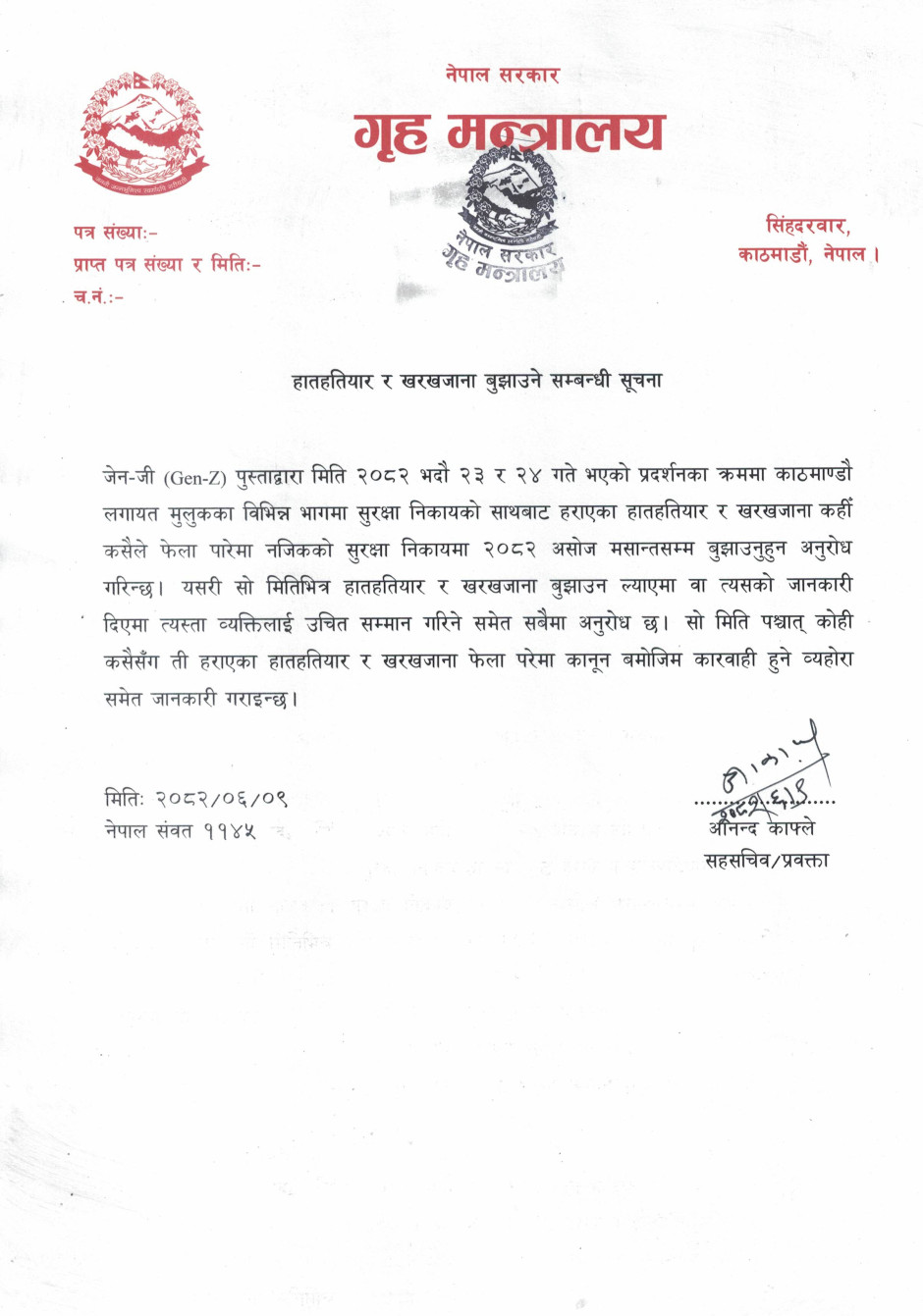 हातहतियार र खरखजाना बुझाउने सम्बन्धी सूचना
