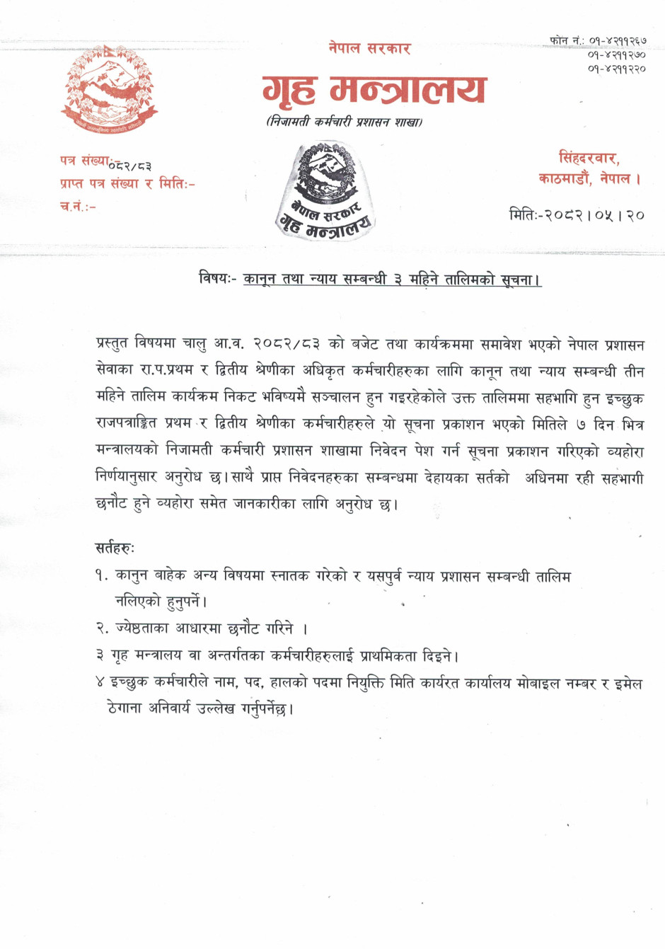 कानून तथा न्याय सम्बन्धी ३ महिने तालिमको सूचना ।