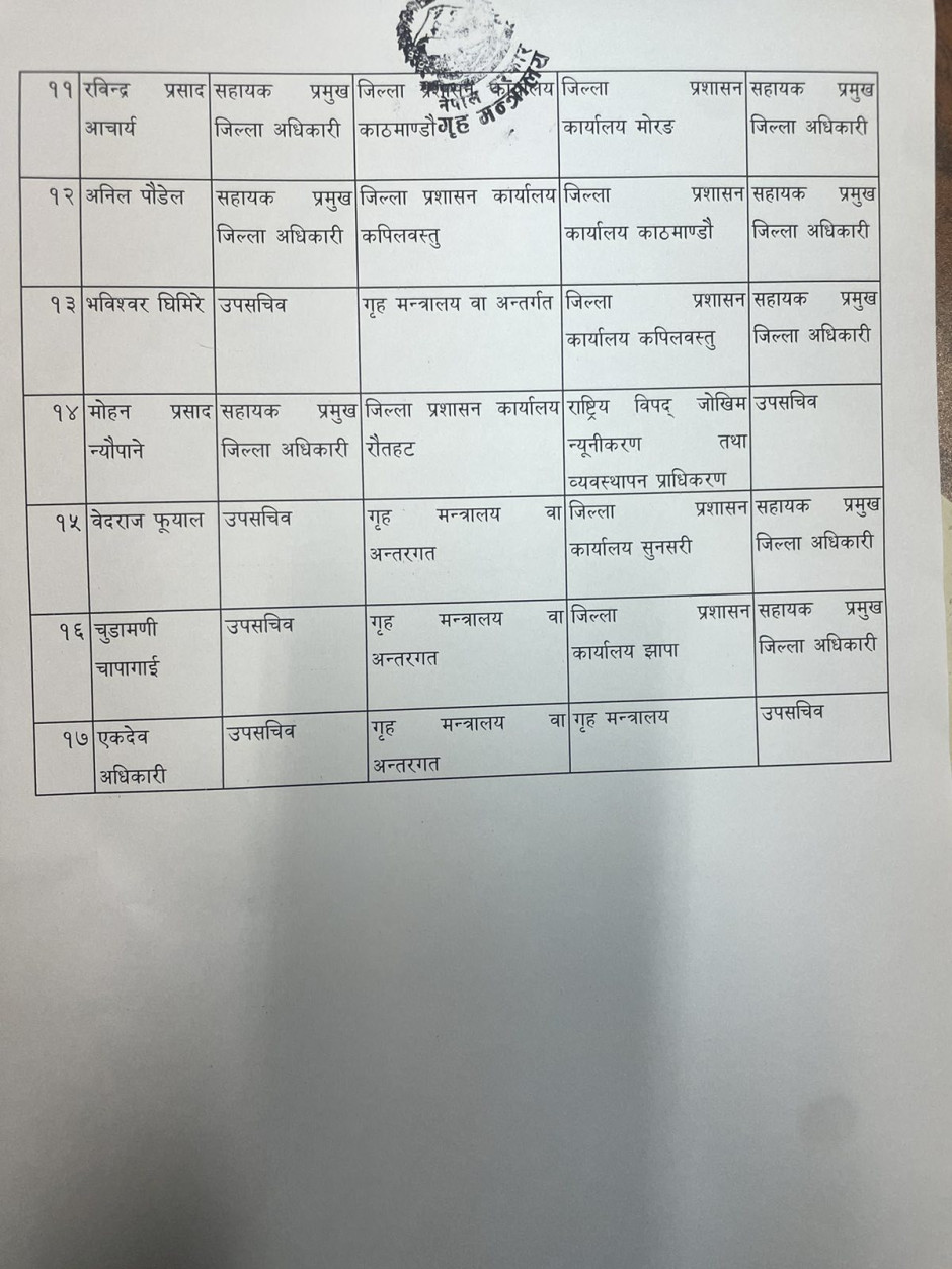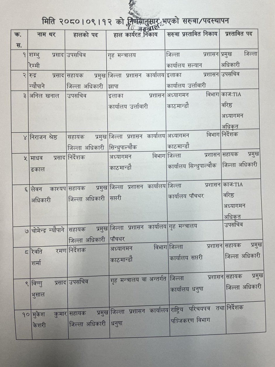 गृह मन्त्रालयको मिति २०८२।१२।२७ को निर्णयानुसार सरुवा/पदस्थापन भएका रा.प. द्वितीय श्रेणीका कर्मचारीहरूको विवरण