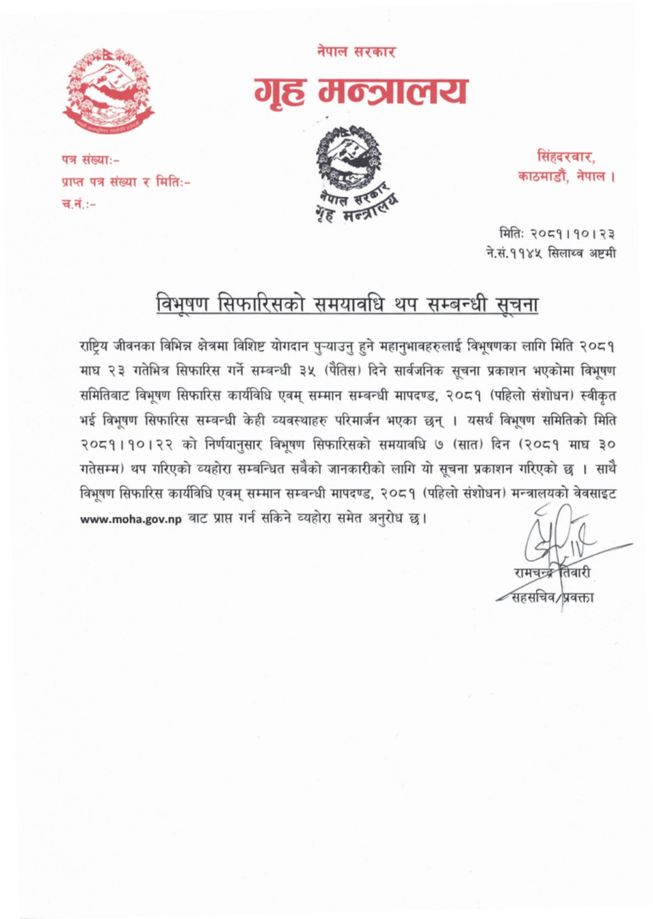 विभूषण सिफारिसको समयावधि थप सम्बन्धी सूचना