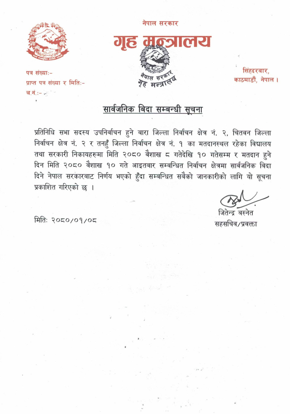 सार्वजनिक बिदा सम्बन्धी सूचना