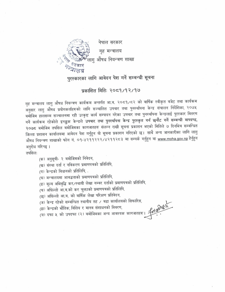 पुरस्कारका लागि आवेदन पेश गर्ने सम्बन्धी सूचना