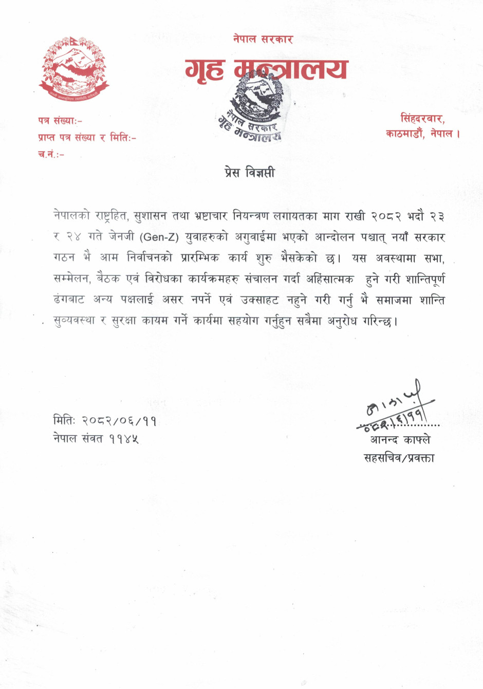 गृह मन्त्रालयसँग सम्बन्धित गुनासोका लागि सम्पर्क नम्बर