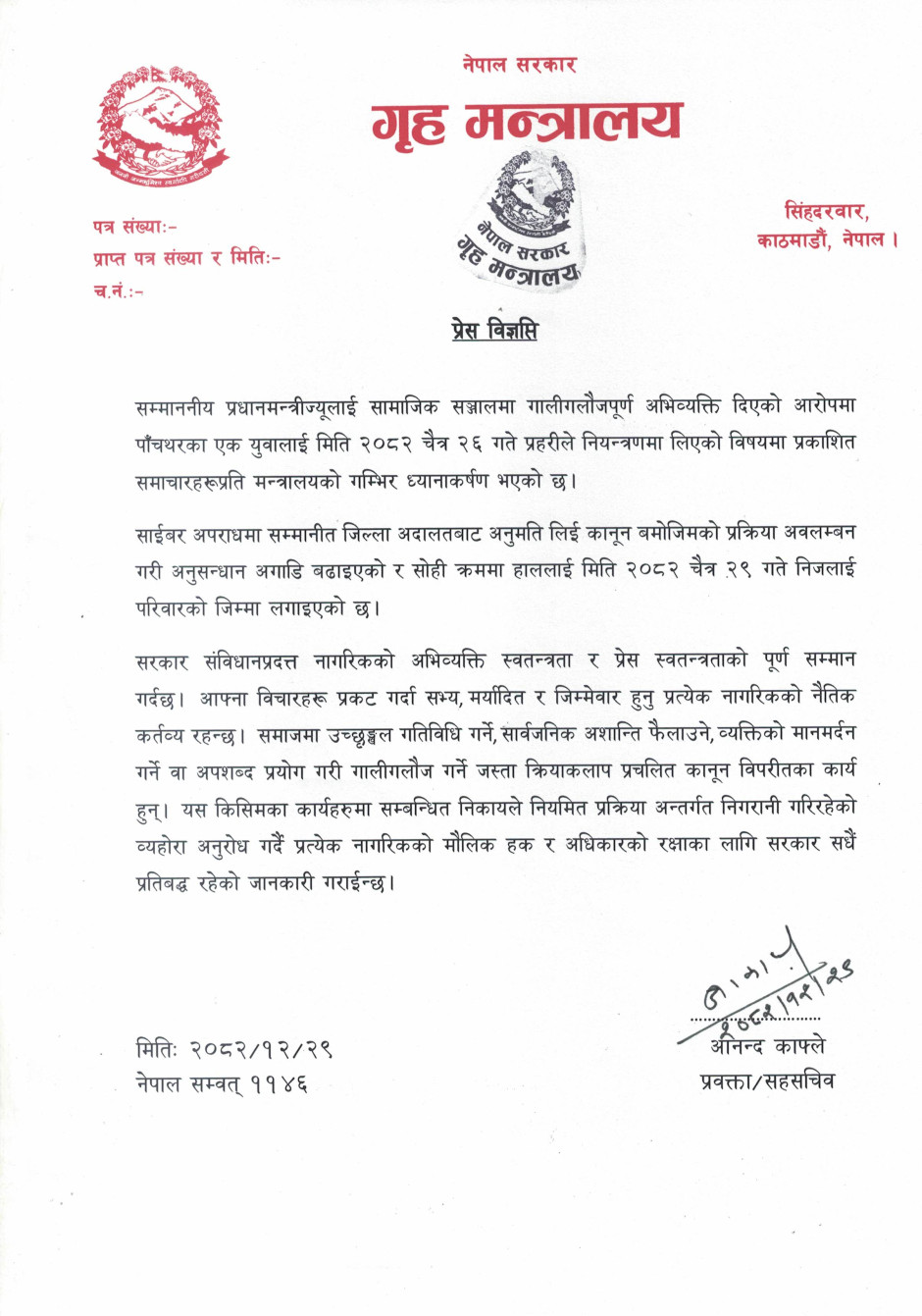 गृह मन्त्रालयसँग सम्बन्धित गुनासोका लागि सम्पर्क नम्बर