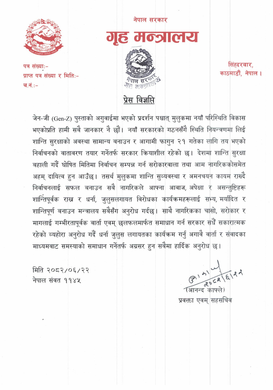 गृह मन्त्रालयसँग सम्बन्धित गुनासोका लागि सम्पर्क नम्बर