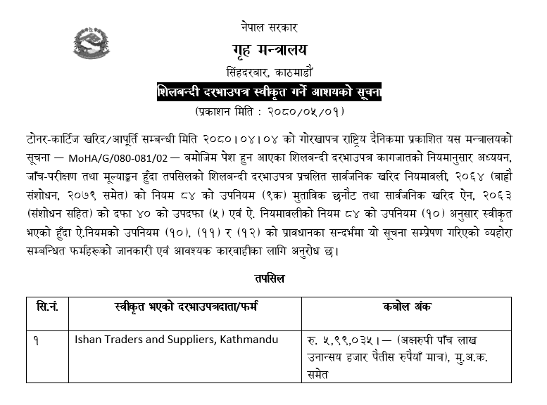 शिलबन्दी दरभाउपत्र स्वीकृत गर्ने आशयको सूचना