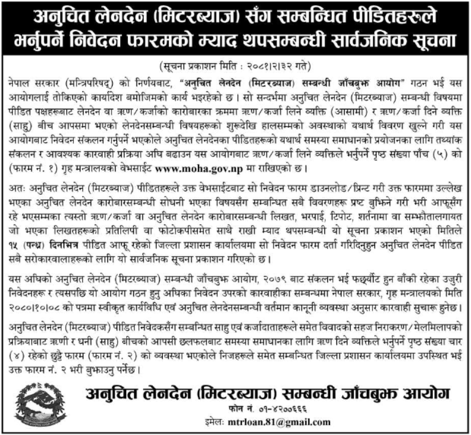 अनुचित लेनदेन (मिटरब्याज) सम्बन्धी गोरखापत्रमा प्रकाशित सूचना