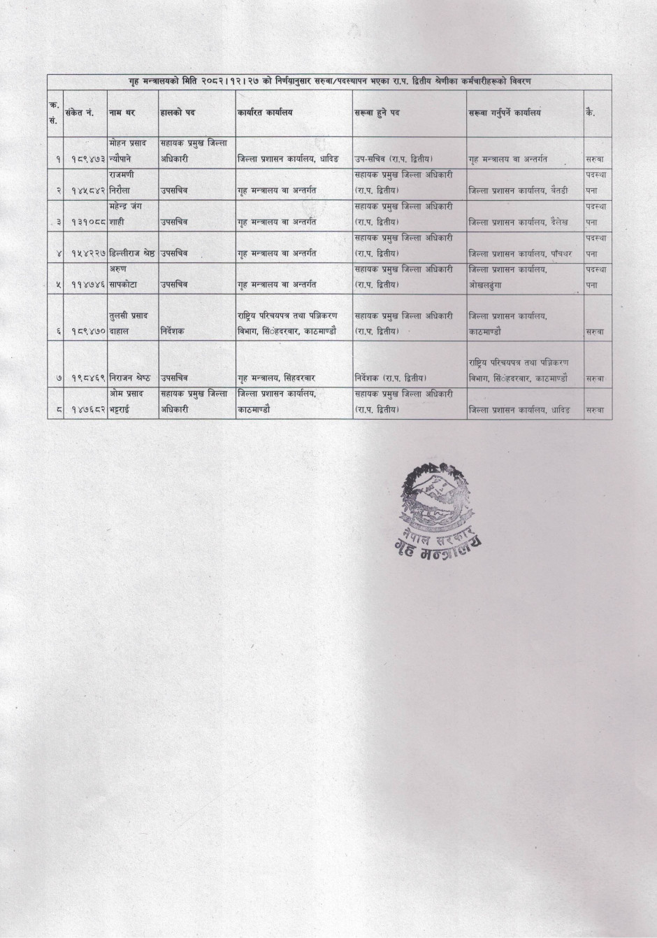 गृह मन्त्रालयको मिति २०८२।१२।२७ को निर्णयानुसार सरुवा/पदस्थापन भएका रा.प. द्वितीय श्रेणीका कर्मचारीहरूको विवरण