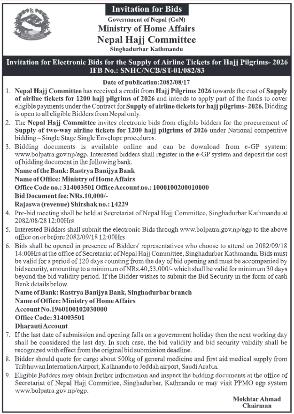 Supply of Airline Tickets for Hajj Pilgrims- 2026 खरिद सम्बन्धी बोलपत्र आव्हानको सूचना