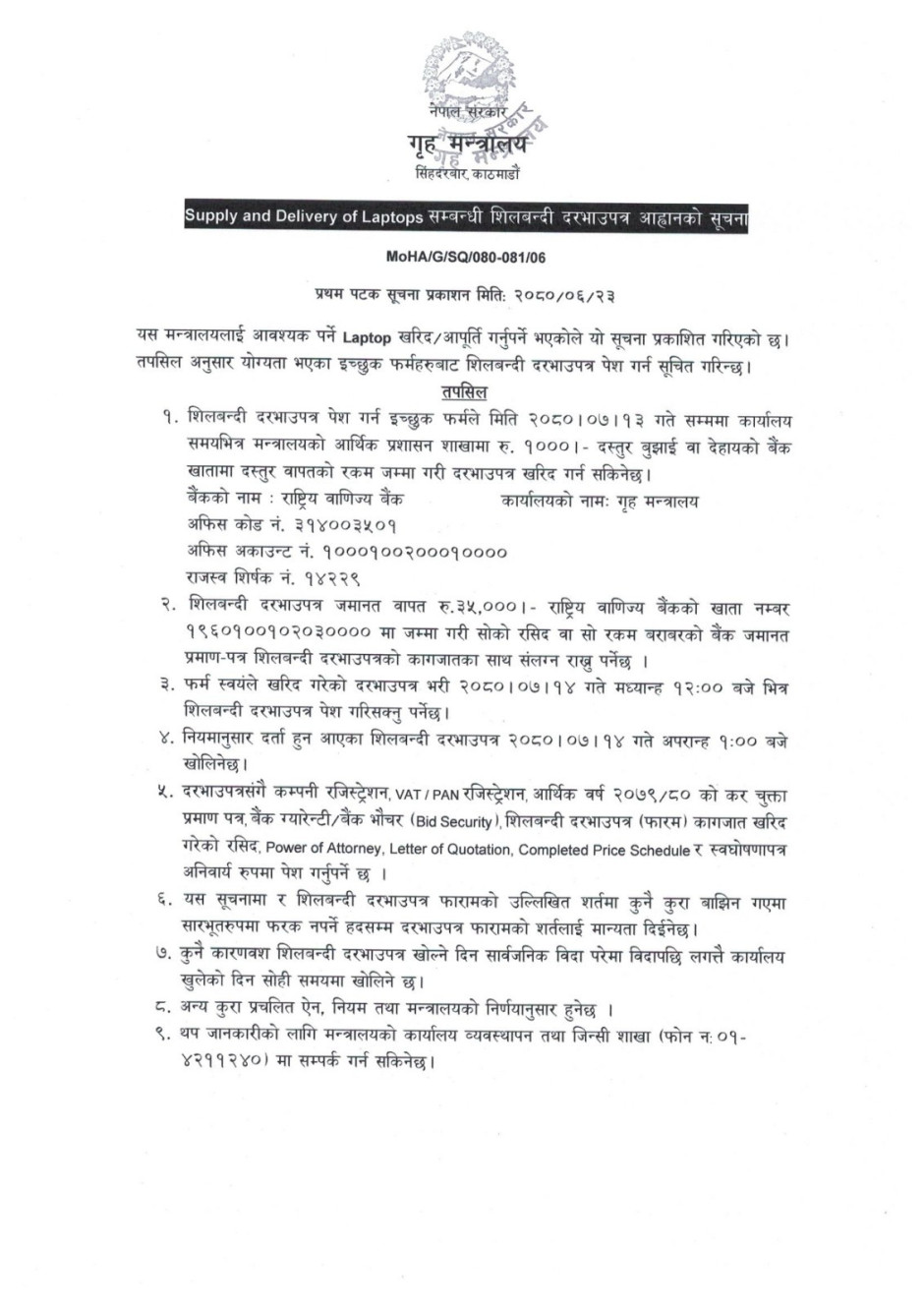 Supply and Delivery of Stationery and Miscellaneous Goods खरिद सम्बन्धी बोलपत्र आव्हानको सूचना