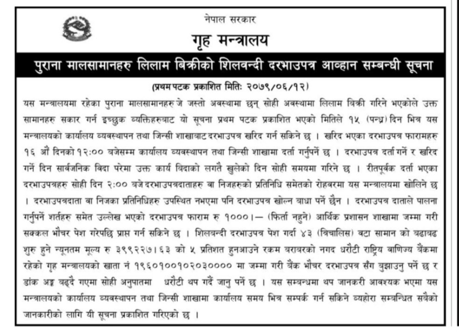 पुराना मालसामानहरु लिलाम बिक्रीको शिलबन्दी दरभाउपत्र आव्हान सम्बन्धी सूचना