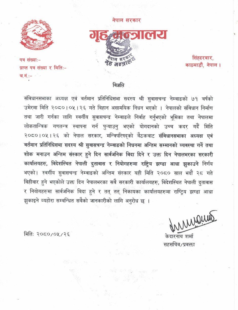 संविधानसभाका अध्यक्ष एवं वर्तमान प्रतिनिधिसभा सदस्य श्री सुवासचन्द्र नेम्बाङको अन्तिम संस्कार हुने दिन (मिति २०८०।०५।२८ गते) शोक मनाउने सम्बन्धमा ।