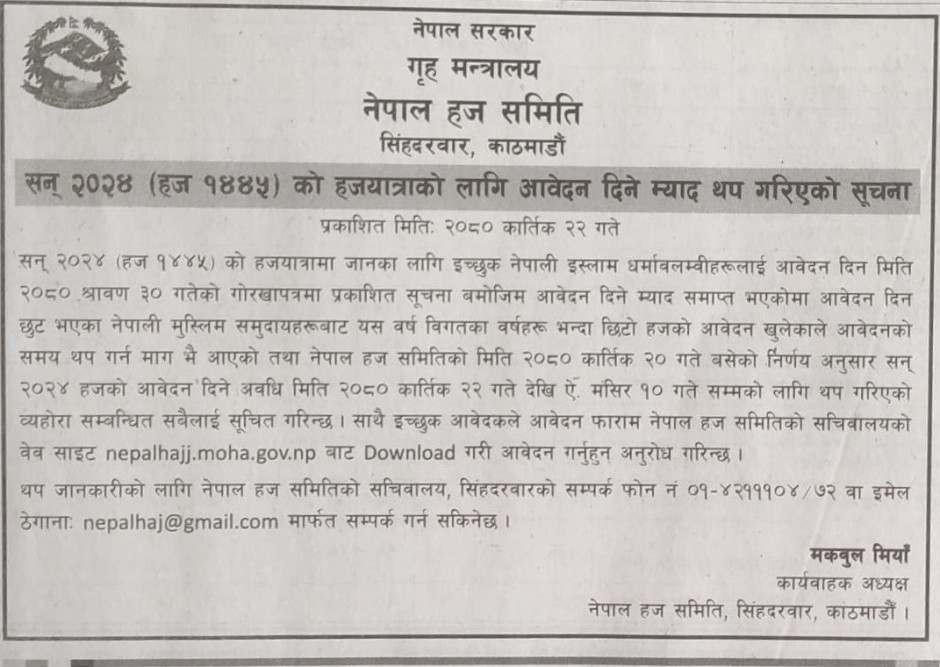 सन् २०२४ (हज १४४५) को हजयात्राको लागि आवेदन दिने म्याद थप गरिएको सूचना