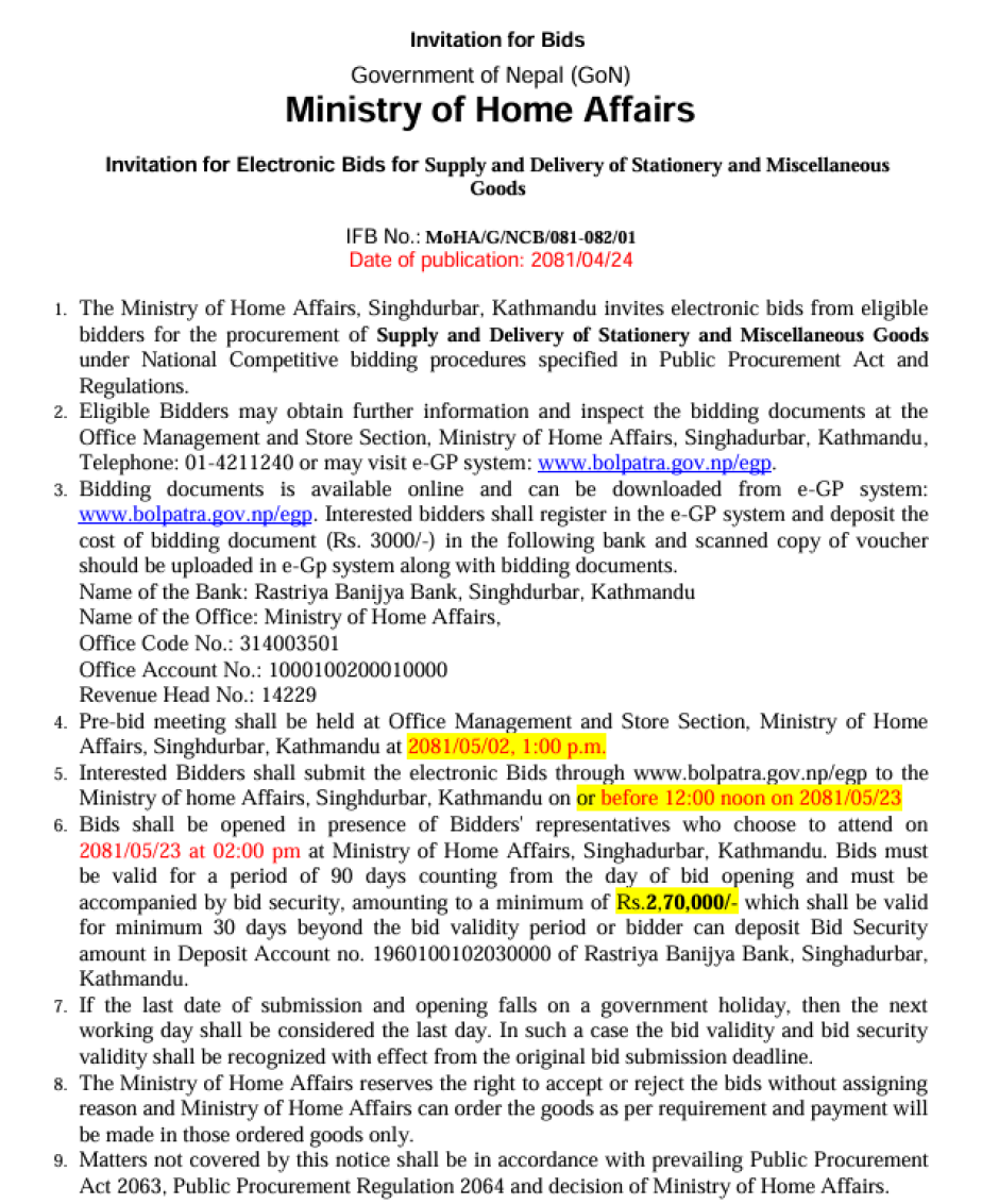 Supply and Delivery of Stationery and Miscellaneous Goods खरिद सम्बन्धी बोलपत्र आव्हानको सूचना